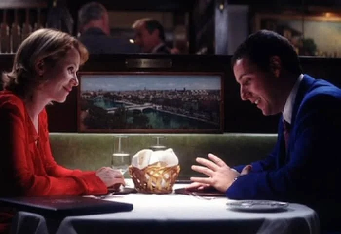 During the scene where Barry Egan (Adam Sandler) is at the supermarket looking for the cheapest Healthy Choice food item, he is being followed by an out-of-focus character in a red outfit. It's Lena Leonard (Emily Watson) before they've been introduced.