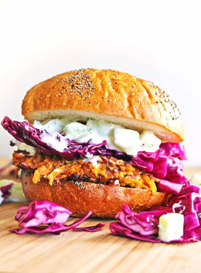 CARROT TAHINI QUINOA VEGGIE BURGER WITH TZATZIKI