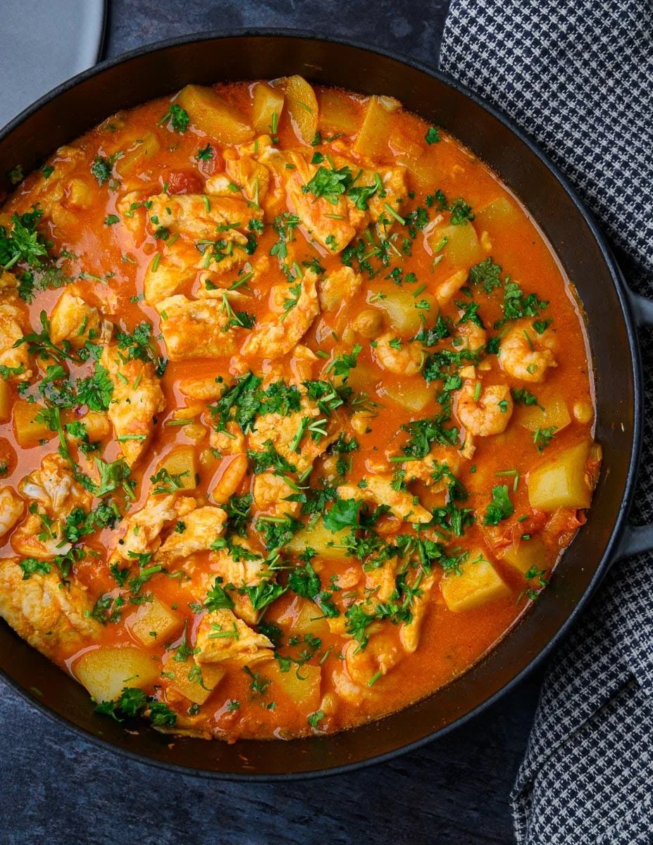 Sea Bass Curry with Crushed Fenugreek Potatoes
