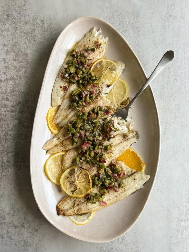 Whole butterflied mackerel with pickled green tomato gribiche and soft herbs
